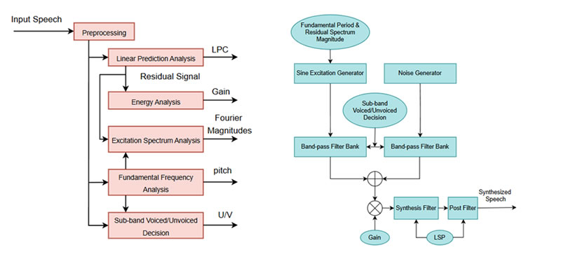 算法在編碼端對輸入語音進行線性預測分析,提取聲道譜包絡參數(shù)(如LPC/LSF),同時估計基音周期、增益以及分帶清濁特征等激勵相關參數(shù)。通過對殘差信號的頻譜結(jié)構建模,實現(xiàn)對周期性成分與噪聲成分的分離與量化表達。解碼端依據(jù)傳輸參數(shù)重建混合激勵信號,并通過合成濾波器恢復語音波形。