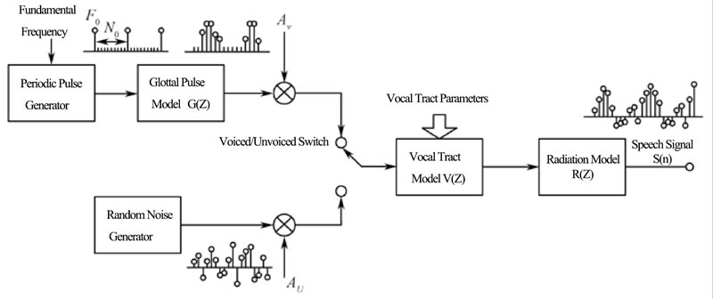 傳統(tǒng)參數(shù)聲碼器基于離散時域語音信號生成模型進行構建,主要由三個部分組成:激勵源、聲學模型以及輻射模型。對于濁音,采用周期脈沖發(fā)生器產(chǎn)生基音頻率;對于清音,激勵信號則由隨機噪聲發(fā)生器產(chǎn)生。信號首先經(jīng)過聲門模型,并通過清濁切換模塊進入聲道模型,在該模型中由聲道參數(shù)決定語音的音色特征。最后,信號再經(jīng)過輻射模型處理,形成最終的語音波形輸出。