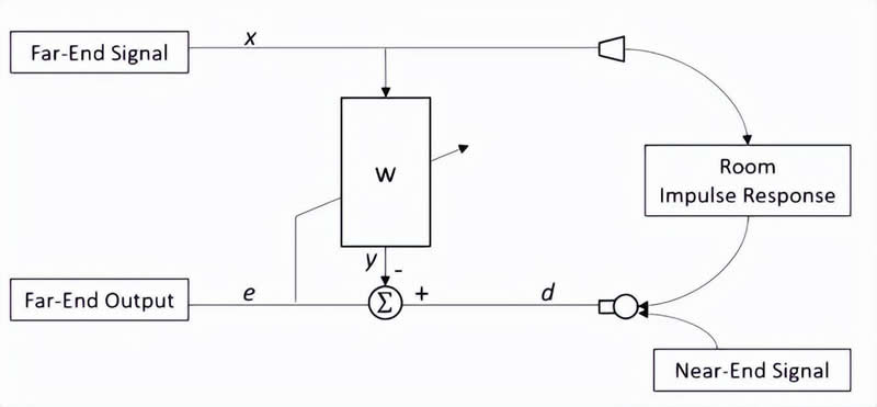 回聲抵消用于全雙工通信系統(tǒng)中抑制聲學(xué)回聲和線路回聲。其基本原理為建立遠(yuǎn)端信號(hào)到本端麥克風(fēng)之間的聲學(xué)路徑模型,并利用自適應(yīng)濾波算法實(shí)時(shí)估計(jì)回聲分量進(jìn)行消除。