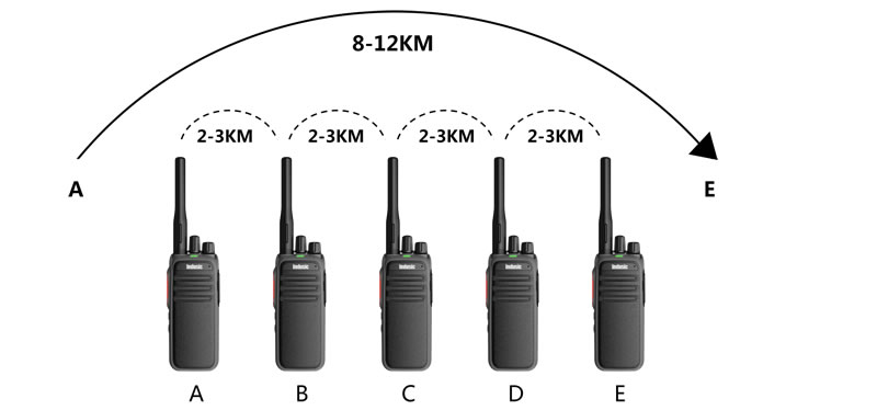 自中繼對講機(jī)基于數(shù)字?jǐn)U頻通信技術(shù),通過對講機(jī)數(shù)據(jù)同頻中轉(zhuǎn)、對講機(jī)話音多級跳轉(zhuǎn),有效地解決了功耗與傳輸距離的矛盾。
